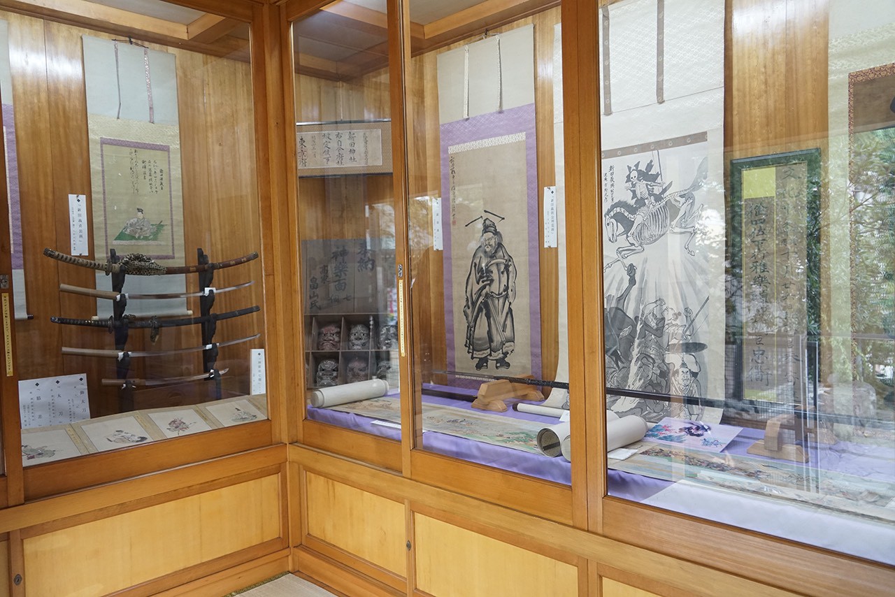 ※主な宝物・新田義興公御真筆・新田大明神縁起絵巻物(都文化財)和鞍、太刀、槍、大鎧、東郷平八郎元帥御真筆他多数展示