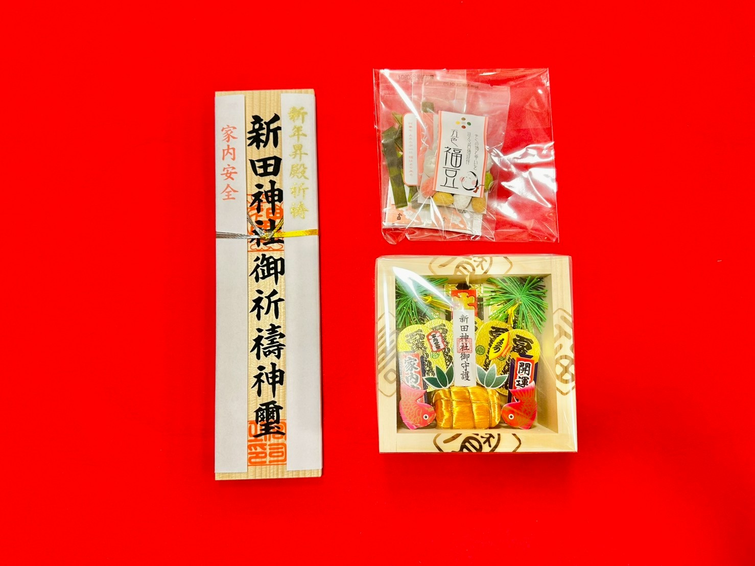 新田神社では、七五三のためにご用意したお守りや記念品、お菓子をおわかちしています。